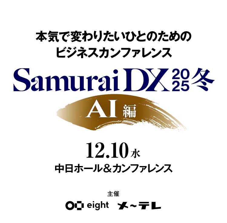 - Eight × 名古屋テレビ共催イベント。ドキュメンタリー番組「SamuraiDX」とコラボし、東海地方のビジネスパーソンを中心にDXに関連する情報をお届けするオンラインイベント。
